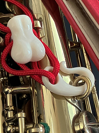 これまでは、象牙のスライダーと銀のフックでしたが…そだ、フックも象牙にしよ…。いいアイディアですね。早速、象牙の仕入れです。以前もネットで利用した象牙堂さんというお店で、ちゃんと正規の物が手に入ります。径40mm、厚さ13mmの円柱の材料です。まず、鉛筆でざっとラフを描いて粗く切り出し、形を想像しながら金ヤスリで削り出していきます。材料はそんなに硬くはないので、丁寧に少しづつ少しづつ…。それから細かい金ヤスリ、あとはサンドペーパーをだんだんと1000番まで。仕上げはマイクロファイバークロスでスリスリと…。スンバラシイ出来上がりです。仕上がりは高さ33.5mm、厚さ6.5mmほどになりました。強度上、銀製より一回り大きくしています。とても品のいい出来です。赤いロープと赤い革のネックストラップと共に、金色のサックスにとてもよく似合います。きっといい音がしますよ。では…うん、柔らかくよく響く…どれ、前の銀のフックは…ん、同んなじか…。