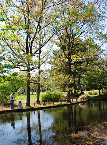 三鷹市ってけっこう田舎ですから、池だの川だの原っぱなんてのがありますよ。ここは丸池公園といいまして、杏林大学病院のすぐ近くにあります。湧き水の池と原っぱ…この公園の向こうには仙川という川が流れていて、右側には勝渕神社、その周りには雑木林が…のんびりしたいいところです。この丸池あたり、昔は湧き水がとても豊富で綺麗な池だったようです。一度は埋め立てられてしまいましたが、また復活されて綺麗に整備されたということです。仙川ももう上流からの流れはないんですが、丸池あたりの湧水や地下水を汲み上げて川の途中から流して水を循環し川の表情を保っています。ほっとけば、丸池も仙川もないということですね。それだけ、世の中が平和で豊かになって来たということで、みなさん、いい時代に生きているんですよ。